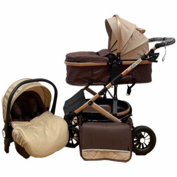 Carucior pentru copii Baby Care Pro 531 Bej Maro 3 in 1 Transformabil, Cadru Aluminiu, Amortizoare, Roti din cauciuc, Spatar reglabil 3 trepte, Plasa insecte, Geanta