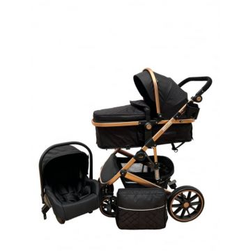 Carucior pentru copii Novokids X2000 series Negru 3 in 1 , spatar reglabil, reversibil, landou , geanta, cadru aluminiu Gold, amortizoare, roti din cauciuc, scoica auto, plasa insecte